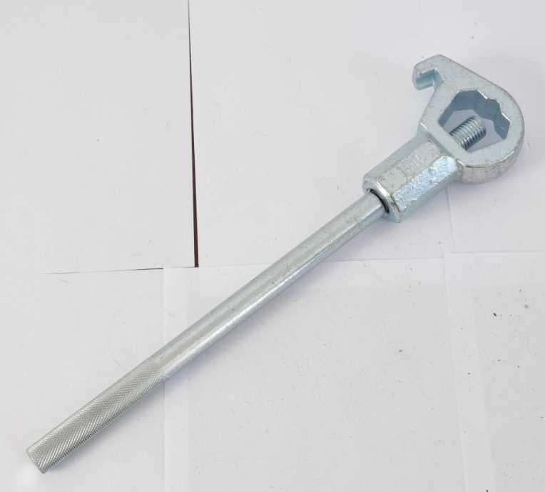 Adj. হাইড্রেন্ট রেঞ্চ: ইস্পাত হ্যান্ডেল। কাস্ট লোহার মাথা। 1 1/4" সর্বোচ্চ। পেন্টাগন ওপেন-ইন। পিন বা রকার লগ থ্রু 3" এর জন্য।